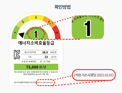 - 에너지 소비 효율 '등급'과 '적용 기준 시행일' 2가지 조건을 동시에 충족하는 제품만 환급 대상입니다.
